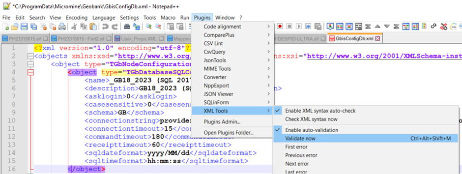 - Open the XML file using a text editor like Notepad++ with “XML Tools Plug-in” enabled to leverage syntax-checking features.