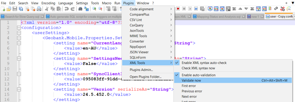 Go into this folder. - Locate the XML file `user.config’ and open it using a text editor like Notepad++ with “XML Tools Plug-in” enabled to use syntax-checking features.