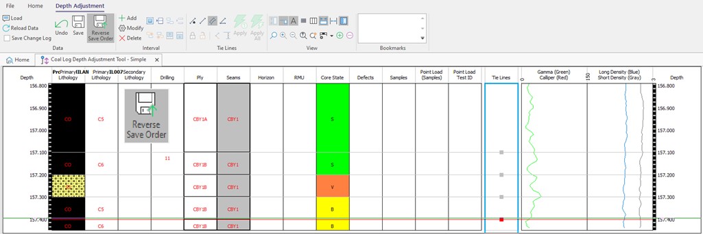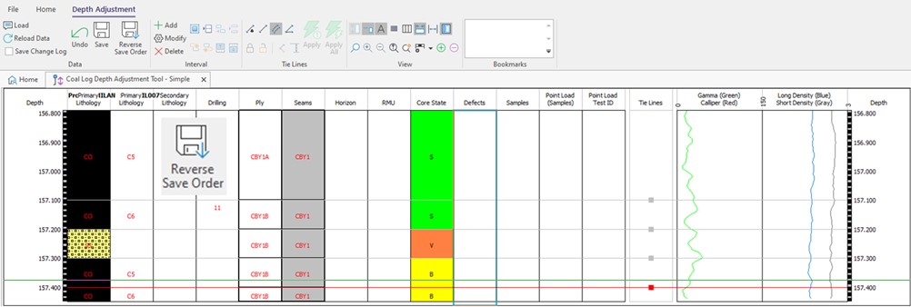 The reverse save order feature in Geobank’s DAT allows users to change the direction (top-down or bottom-up) of background SQL update statements to the applied downhole tables. Following the example above, the core correction is moving the raw lithology depths down to align with geophysical signatures. The current save order is top-down as indicated by the down arrow in Figure 3.
