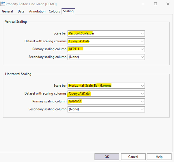 Assuming that vertical scaling has been set to depths for downhole reports, the final area of configuration is linking both vertical and horizontal scaling for your graph.