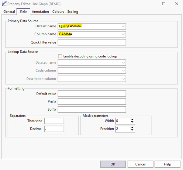 Graphs within graphic reports show a visual representation of data. Some example datasets used as graphs within reports would be geophysics, assay values, percentages or ranges. There are several areas to note when setting up a point, line or bar graph in Geobank’s graphic reports.