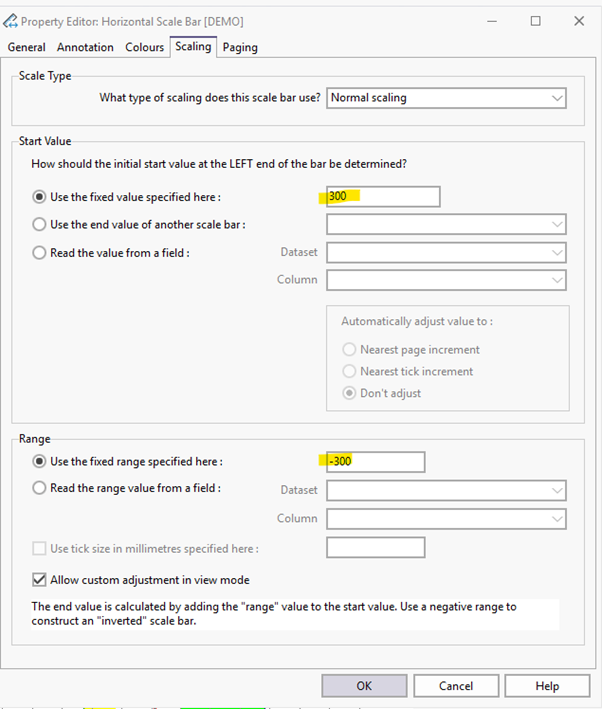 Next up, is in the configuration of the report itself under the designer tab. In the report configuration area, you can select Horizontal scaling. Using a scale-bar allows scaling lines to run clearly through your chart, especially useful for line-graphs for geophysics. Configure your Horizontal scaling to the report area. There is an option here to set your range of values for your scale.